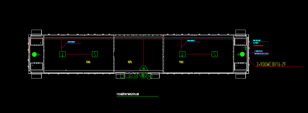 此次集裝箱有一套 45 尺規格,通過客戶提供的圖紙,振興消防工程師連夜著急工程師進行開會討論,由負責的工程師連夜趕制出方案發給客戶,又和客戶的交流溝通中修改了N 次,最終確認了方案達成合作。根據《氣體滅火系統設計規范》GB50370、《氣體滅火系統施工及驗收規范》GB50263、《火災自動報警系統設計規范》GB50116 中的要求,這套儲能集裝箱消防系統由七氟丙烷滅火裝置、藥劑釋放管路和火災探測報警三大部分組成,根據集裝箱規格,設計采用 兩個30L 七氟丙烷滅火裝置,充裝 58KG 滅火藥劑,配置 2個感溫探測器和2 個感煙探測器與火災報警主機等形成一套完整的滅火系統。同時和業主的結構工程師一起交流確定儲能集裝箱外部報警設備能夠正常按照他們的箱體進行設計保護;內部管道固定方式;滅火裝置如何固定在運輸中才會更牢靠以及如何實現發生火災報警信號傳達給業主等細節。CAD 平面圖如下:
