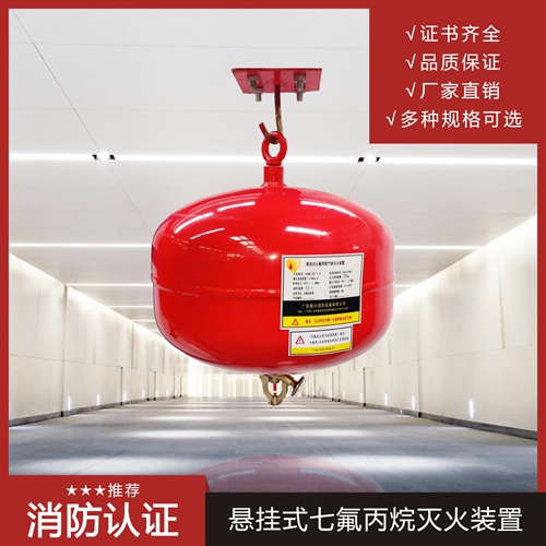 電磁型懸掛式氣體滅火裝置由滅火劑儲存罐體、電磁驅動部件、噴嘴、壓力顯示部件、信號反饋部件組成,可懸掛或固定于墻壁上,與火災探測部件、火災警報器及滅火控制器組成一套自動滅火裝置,具有不占地、安裝簡便的特點。